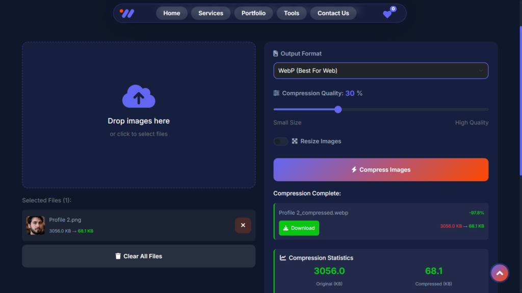 Convert images into next-gen formats like WebP, control compression quality, and reduce image file sizes by up to 90% without noticeable loss in visual quality.